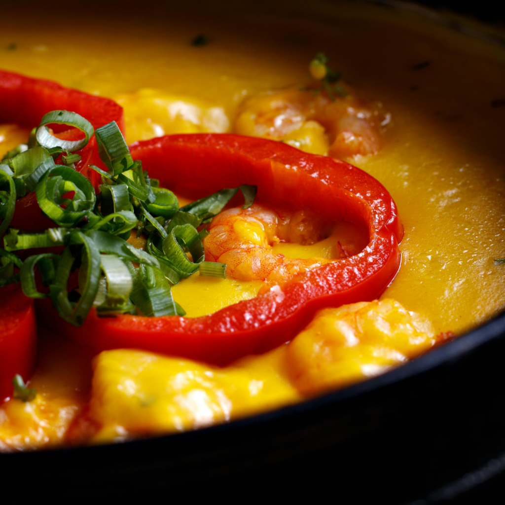 - Postas de peixe cozidas em leite de coco, azeite de dendê, tomate e pimentão.
